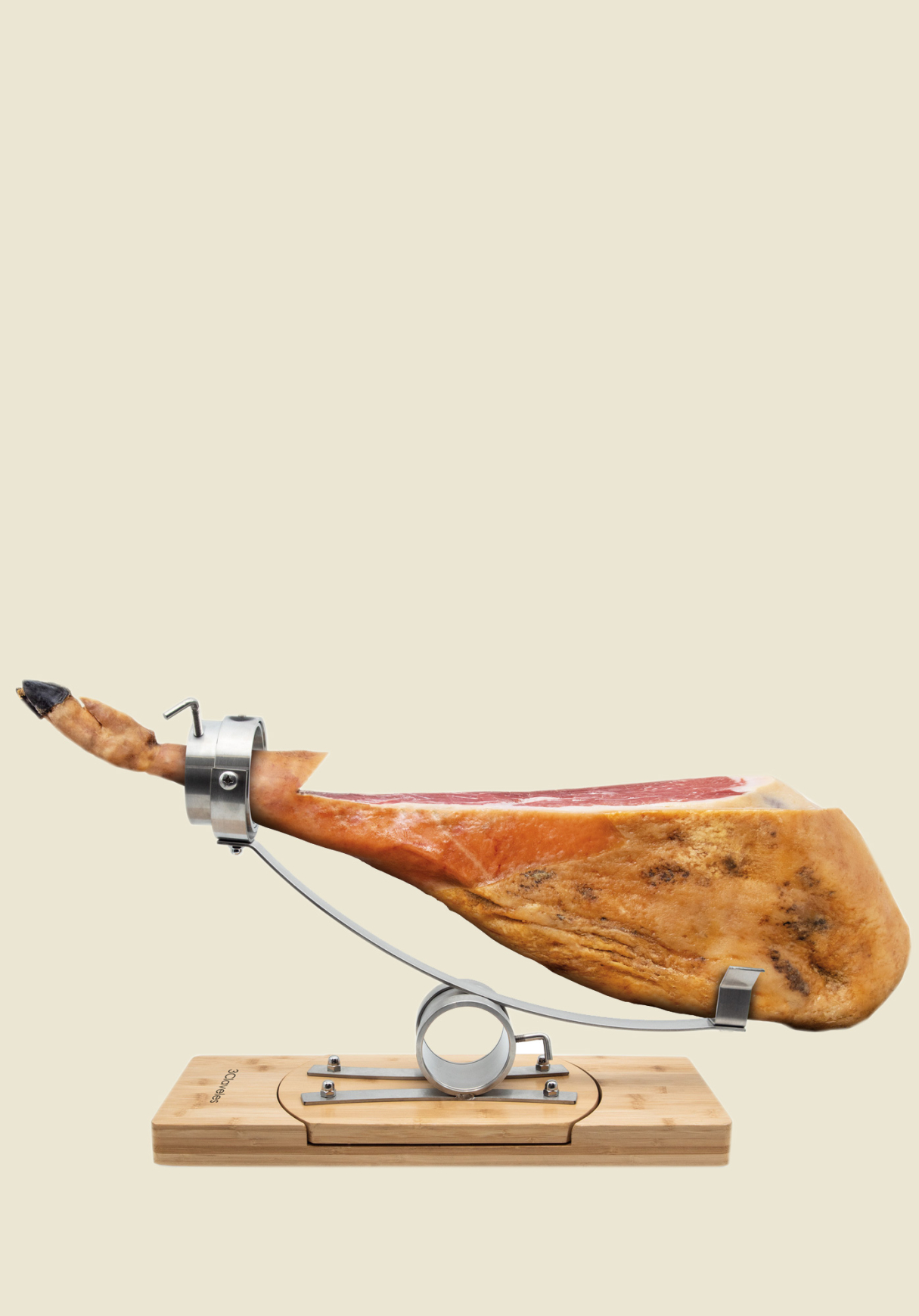 Dieser hochwertige Schinkenhalter ist mit einem robusten Drehkopf ausgestattet, der es ermöglicht, den Jamón sicher zu fixieren und während des Schneidens mühelos zu drehen.
